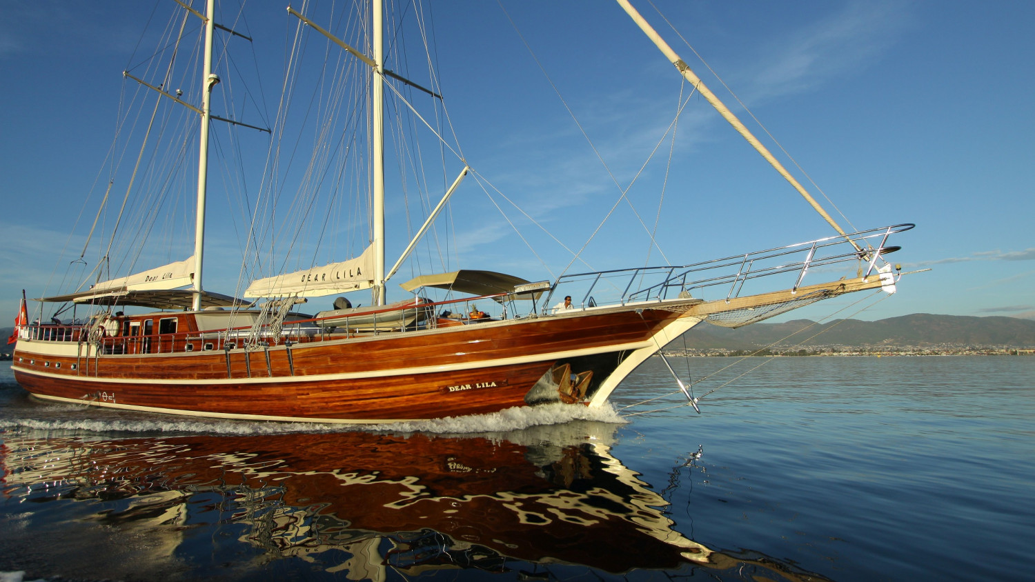 The gulet Dear Lila was built in 2012. This boat that is 33 m long and 7,60 m large is providing Blue Cruise services to our dear guests with its 4 crew members. Our yacht that holds 2 Master Cabins, 2 Double Cabins, 2 Triple Cabins , more elegantand comfy than each other with their own WC and air conditioning, with a total of 6 cabins. It possess a 2 x 440 DAF horsepower and a 2 X 44 KWA PERKINS generator. A dedicated living space fort the crew, a fully furnished kitchen, indoor and outdoor spaces for eating and relaxing, and an American bar are available. There are enough sun bath cushions, chairs and services for every single guest. This yacht that is built to make our guests live the comfort, the luxury and the serenity at the same time, can reach a speed up to 13 nautical mile. Dear Lila Gulet, fully furnished with navigational devices Wireless, GSM Phone you will feel in security during all of our preferred destinations like Bodrum, Marmaris, Fethiye, Göcek Beside that, a LCD TV, a DVD player and a stereo music player are available for our dear guests in the living room. For those who want to stay connected, a Wi-Fi service can be provided in our boat, limited inside the Turkish waters. Our sportive guests can optionally participate to watersports excursions such as Ringo, Water Ski, Canoe, An occasion for our guests that want to enjoy their Blue Cruise in the virgin bays of Turkey to entertain themselves.
