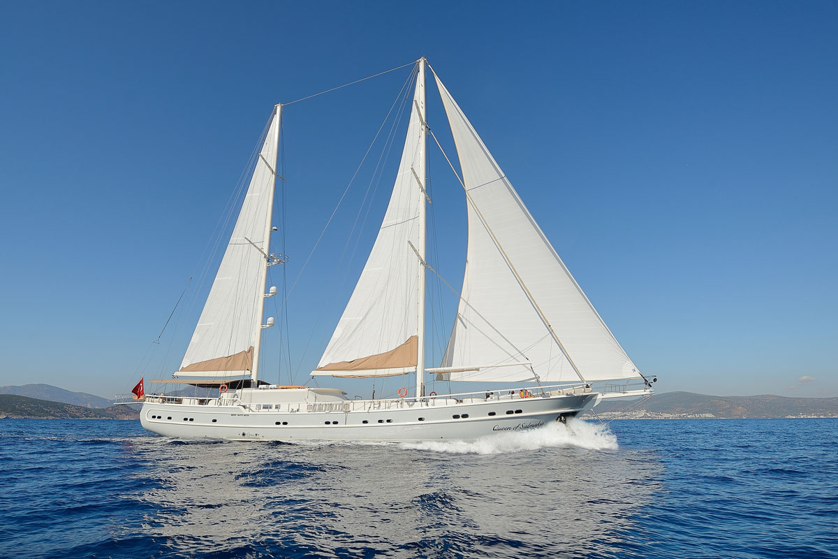 Built in 2019, Queen of Salmakis is a majestic 39.10-meter sailing yacht with an 8.50-meter beam, representing the finest in modern wooden yacht design. With her certified hull construction, she offers a balanced combination of elegance and stability. Based in Bodrum and operating across Turkish and Greek waters, she is a strong option for large groups seeking a high-end charter experience in the Mediterranean.