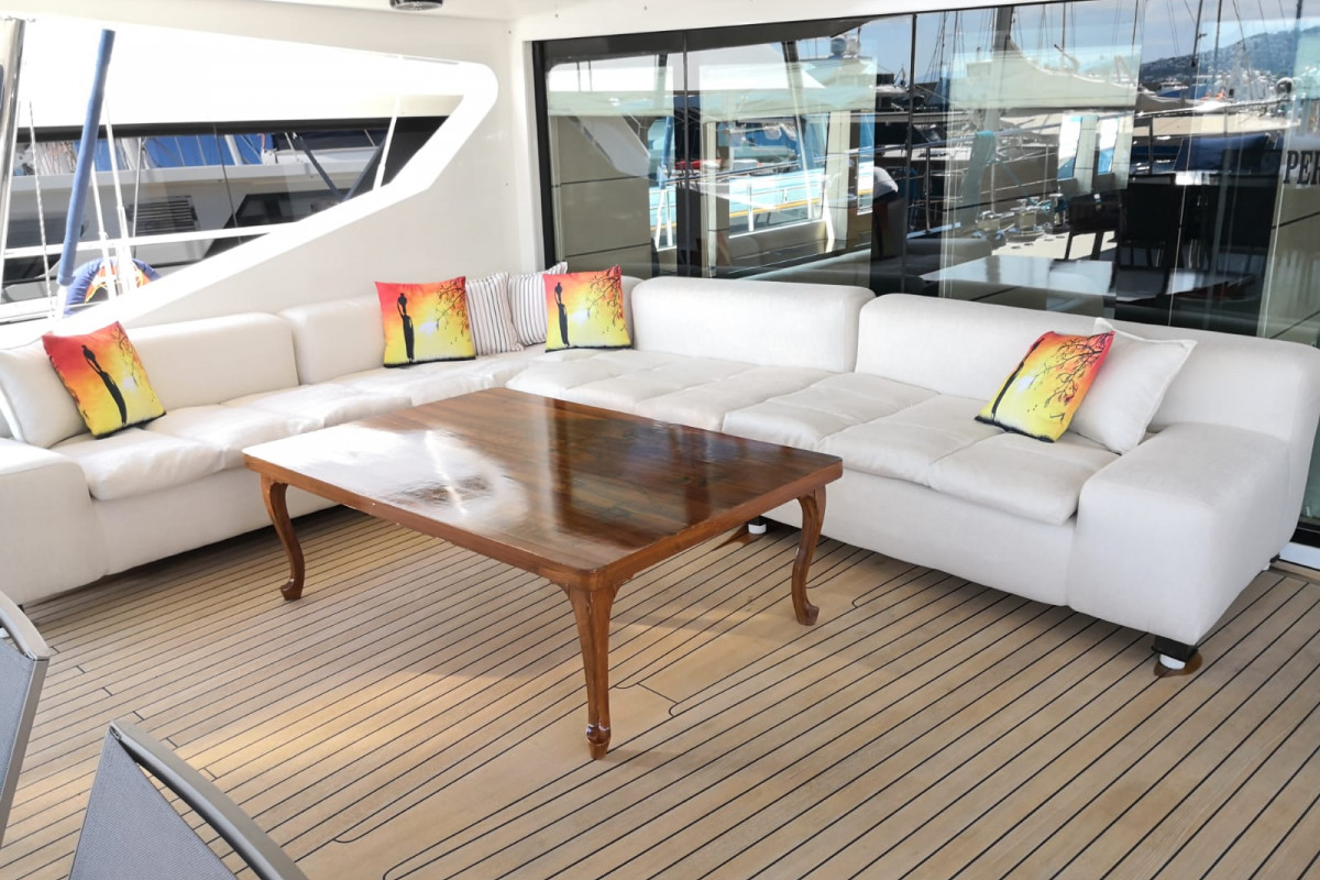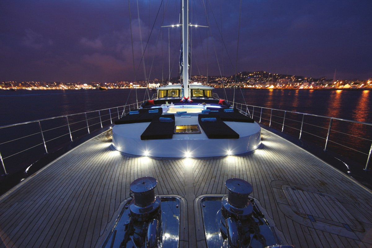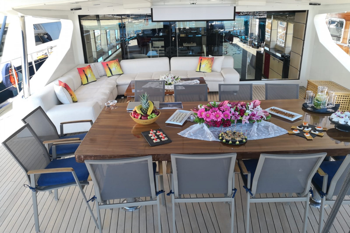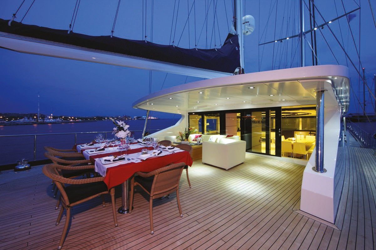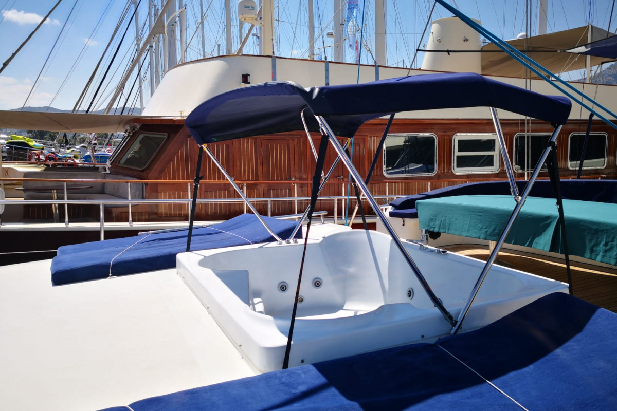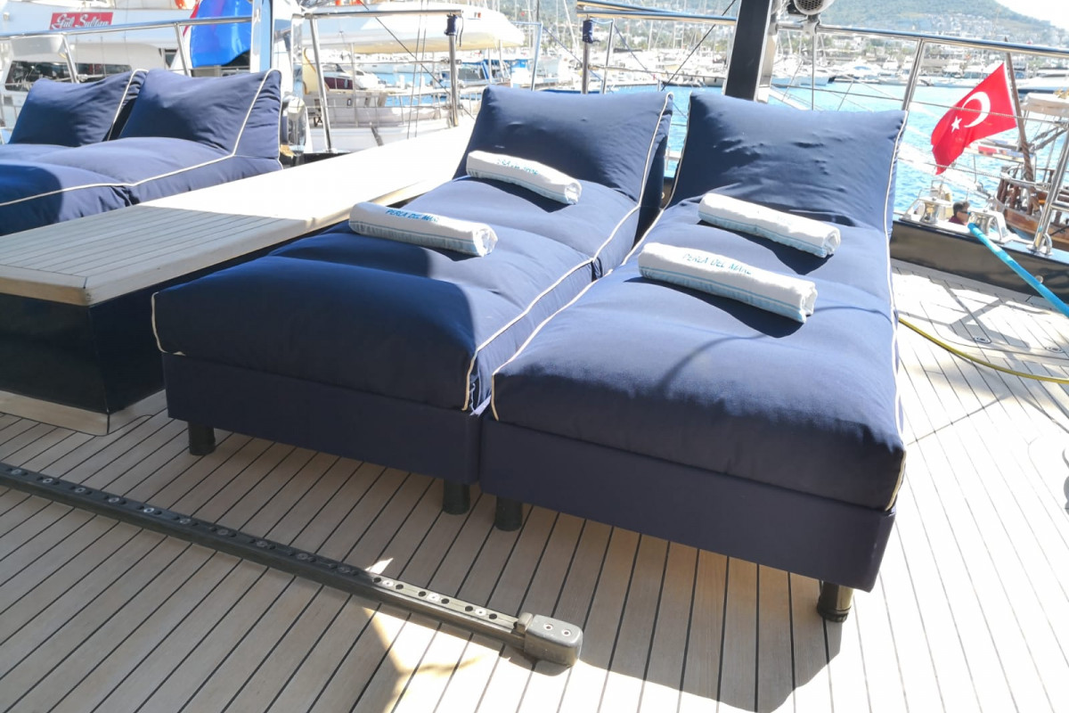 The gulet Perla Del Mare was built in 2010. This boat that is 42,2 m long and 9 m large is providing Blue Cruise services to our dear guests with its 6 crew members. Our yacht that holds 2 Master Cabins, 4 Double Cabins , more elegantand comfy than each other with their own WC and air conditioning, with a total of 6 cabins. It possess a 2 x VOLVO 550 HP horsepower and a 2 x Onan 40 Kva generator. A dedicated living space fort the crew, a fully furnished kitchen, indoor and outdoor spaces for eating and relaxing, and an American bar are available. There are enough sun bath cushions, chairs and services for every single guest. This yacht that is built to make our guests live the comfort, the luxury and the serenity at the same time, can reach a speed up to 12 nautical mile. Perla Del Mare Gulet, fully furnished with navigational devices Wireless, GSM Phone you will feel in security during all of our preferred destinations like Bodrum, Marmaris, Fethiye, Göcek Beside that, a LCD TV, a DVD player and a stereo music player are available for our dear guests in the living room. For those who want to stay connected, a Wi-Fi service can be provided in our boat, limited inside the Turkish waters. Our sportive guests can optionally participate to watersports excursions such as Wake Board, Banana, Knee Board, Ringo, Wind Surf, An occasion for our guests that want to enjoy their Blue Cruise in the virgin bays of Turkey to entertain themselves.