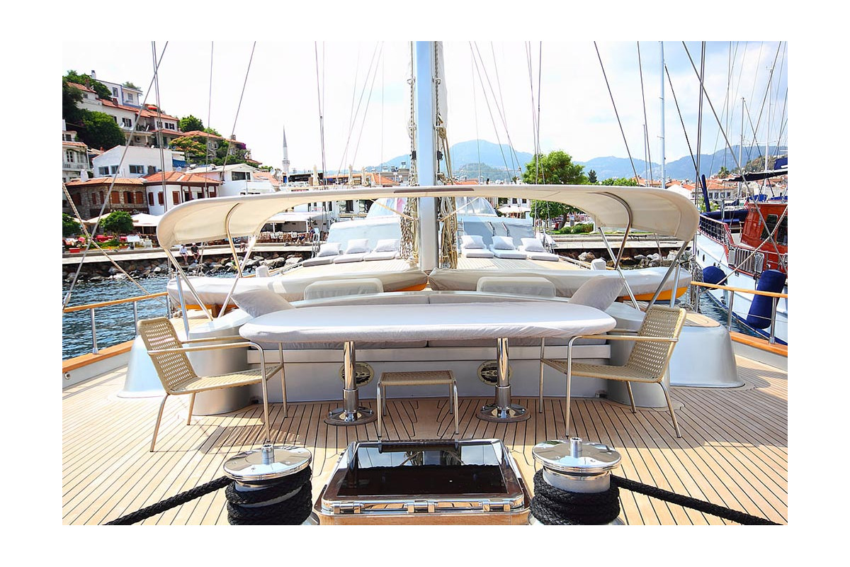 The gulet Silver Moon was built in 2010 . After a renovation in 2020 It took its final form that you can all enjoy today. This boat that is 36 m long and 7,75 m large is providing Blue Cruise services to our dear guests with its 5 crew members. Our yacht that holds 1 Master Cabin, 1 VIP Cabin, 1 Double Cabin, 1 Triple Cabin , more elegantand comfy than each other with their own WC and air conditioning, with a total of 4 cabins. It possess a 2X540 HP Caterpillar horsepower and a 2x22.5 kW onan generator. A dedicated living space fort the crew, a fully furnished kitchen, indoor and outdoor spaces for eating and relaxing, and an American bar are available. There are enough sun bath cushions, chairs and services for every single guest. This yacht that is built to make our guests live the comfort, the luxury and the serenity at the same time, can reach a speed up to 10 nautical mile. Silver Moon Gulet, fully furnished with navigational devices Wireless, GSM Phone you will feel in security during all of our preferred destinations like Bodrum, Marmaris, Fethiye, Göcek Beside that, a LCD TV, a DVD player and a stereo music player are available for our dear guests in the living room. Our sportive guests can optionally participate to watersports excursions such as Banana, Water Skiing, Ringo, An occasion for our guests that want to enjoy their Blue Cruise in the virgin bays of Turkey to entertain themselves.