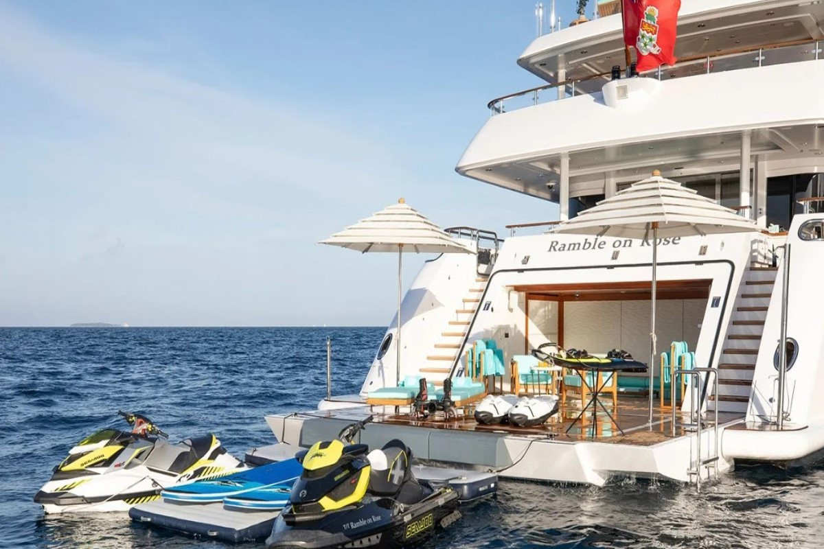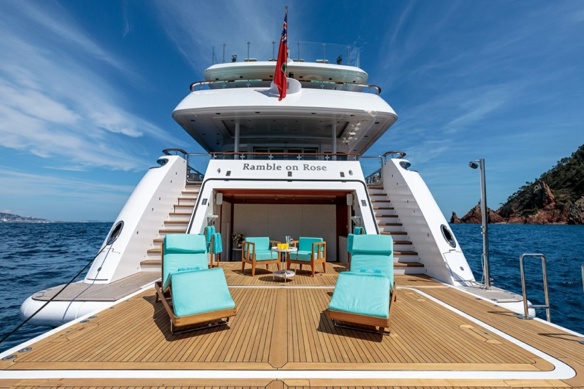 At 196'10"/59.99m, RAMBLE ON ROSE is a 985 GT motor yacht built by CRN in 2011 and last refit in 2022. The steel and aluminum yacht sleeps 12 guests in seven luxurious cabins with elevator access, including a full-beam master with a private balcony. There is further accommodation for a professional crew of 15, wrapped up in an interior penned by Laura Sessa.