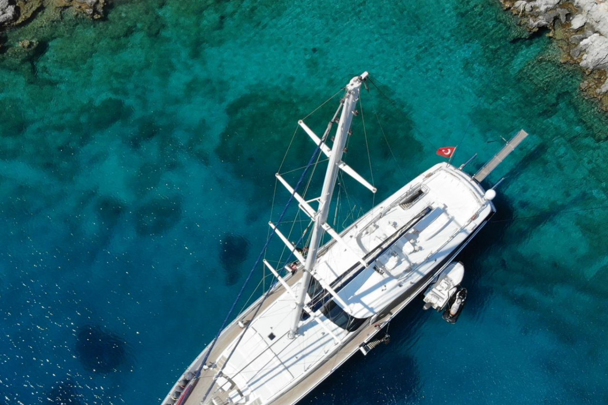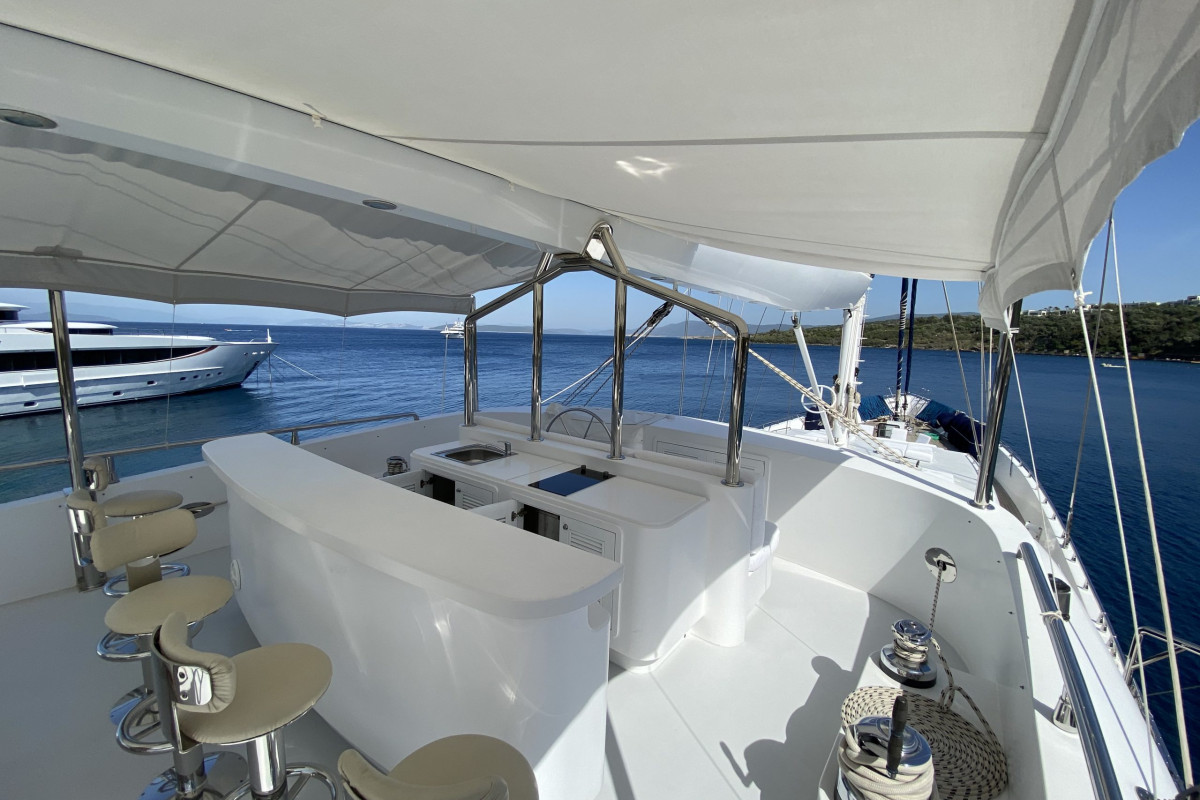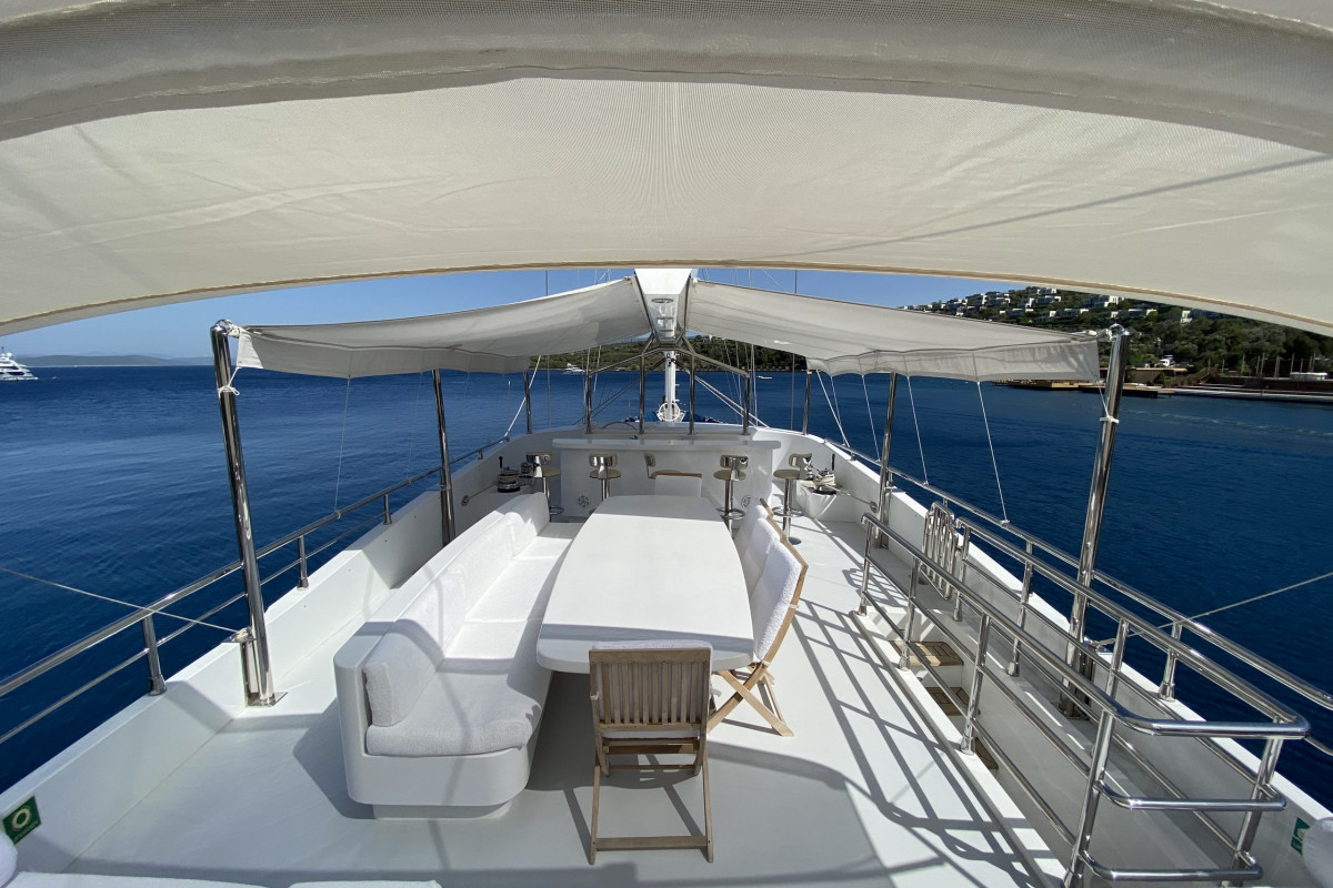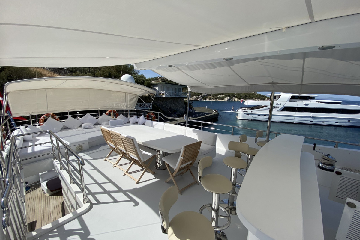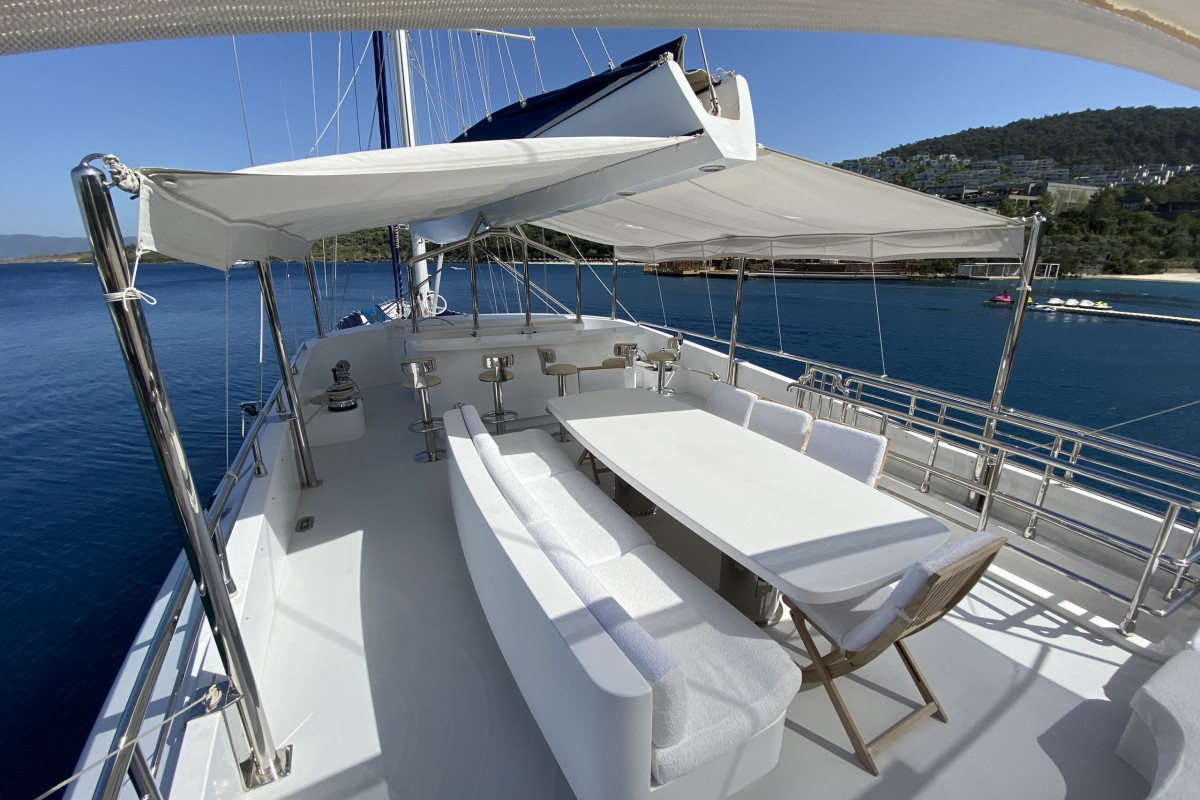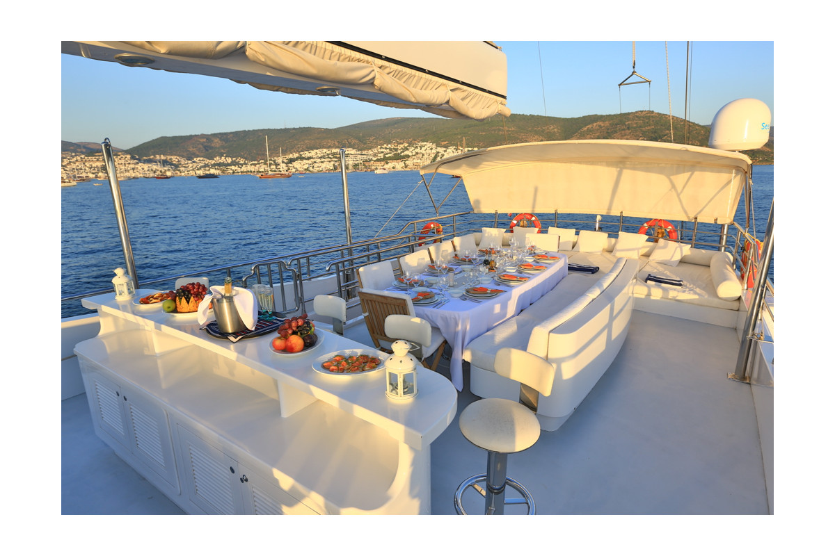 The gulet Gülmaria was built in 2014. This boat that is 37 m long and 8.10 m large is providing Blue Cruise services to our dear guests with its 5 crew members. Our yacht that holds 1 Master Cabin, 1 VIP Cabin, 2 Double Cabins, 2 Triple Cabins , more elegantand comfy than each other with their own WC and air conditioning, with a total of 6 cabins. It possess a 2 X 375 HP horsepower and a 2 X 44 KW / 1 X 27.5 KW generator. A dedicated living space fort the crew, a fully furnished kitchen, indoor and outdoor spaces for eating and relaxing, and an American bar are available. There are enough sun bath cushions, chairs and services for every single guest. This yacht that is built to make our guests live the comfort, the luxury and the serenity at the same time, can reach a speed up to 13 nautical mile. Gülmaria Gulet, fully furnished with navigational devices Wireless, GSM Phone you will feel in security during all of our preferred destinations like Bodrum, Marmaris, Fethiye, Göcek Beside that, a LCD TV, a DVD player and a stereo music player are available for our dear guests in the living room. For those who want to stay connected, a Wi-Fi service can be provided in our boat, limited inside the Turkish waters. Our sportive guests can optionally participate to watersports excursions such as Wake Board, Banana, Ringo, Water Ski, Canoe, An occasion for our guests that want to enjoy their Blue Cruise in the virgin bays of Turkey to entertain themselves.