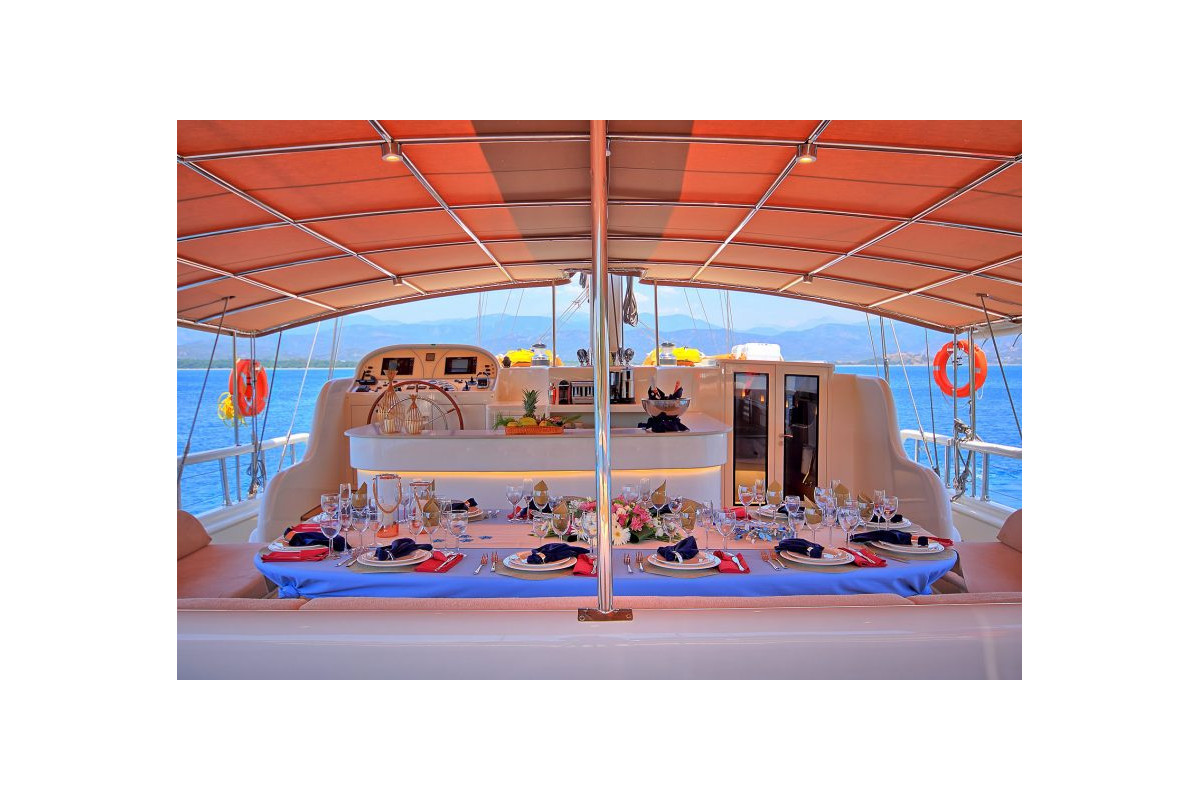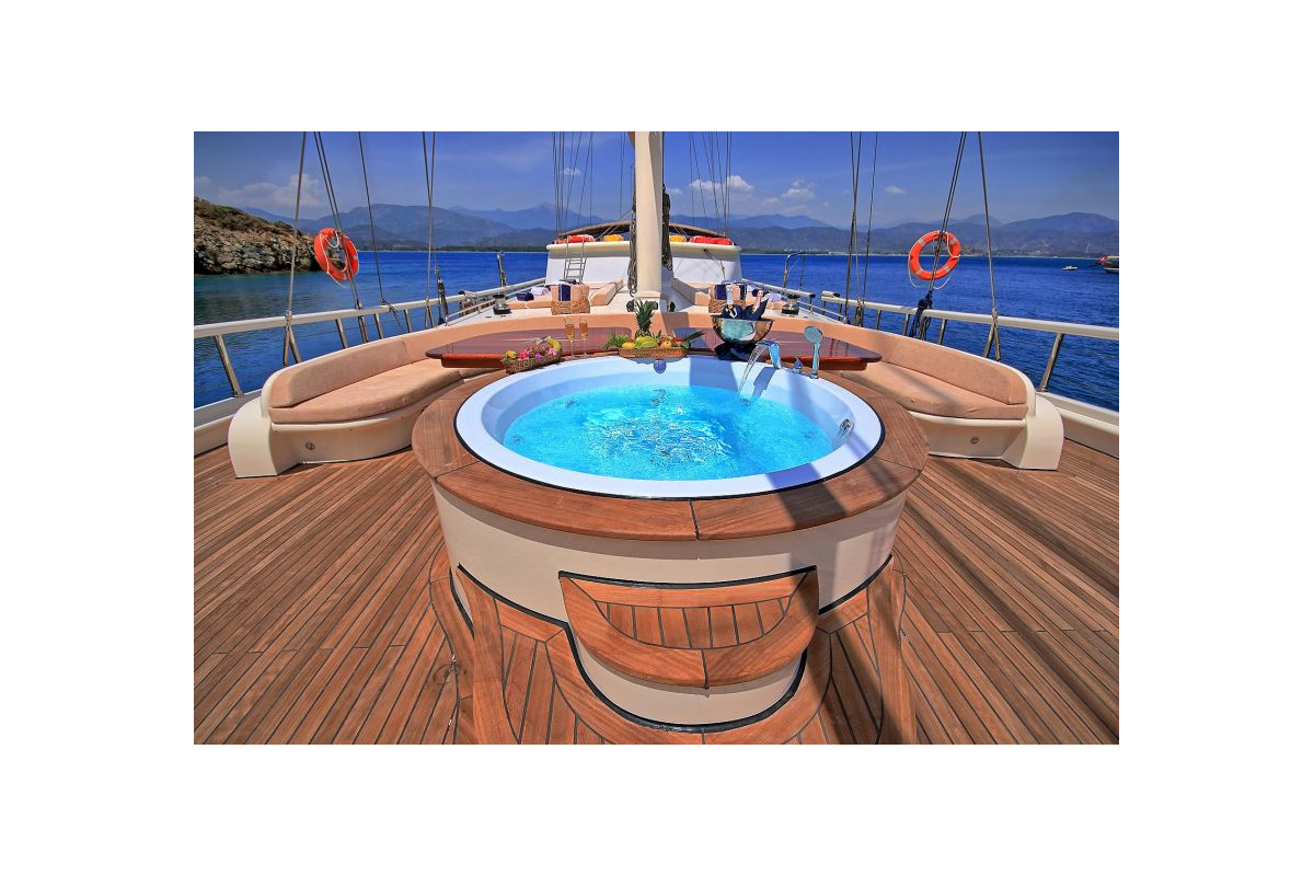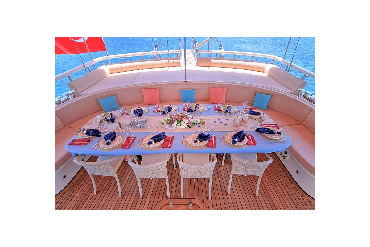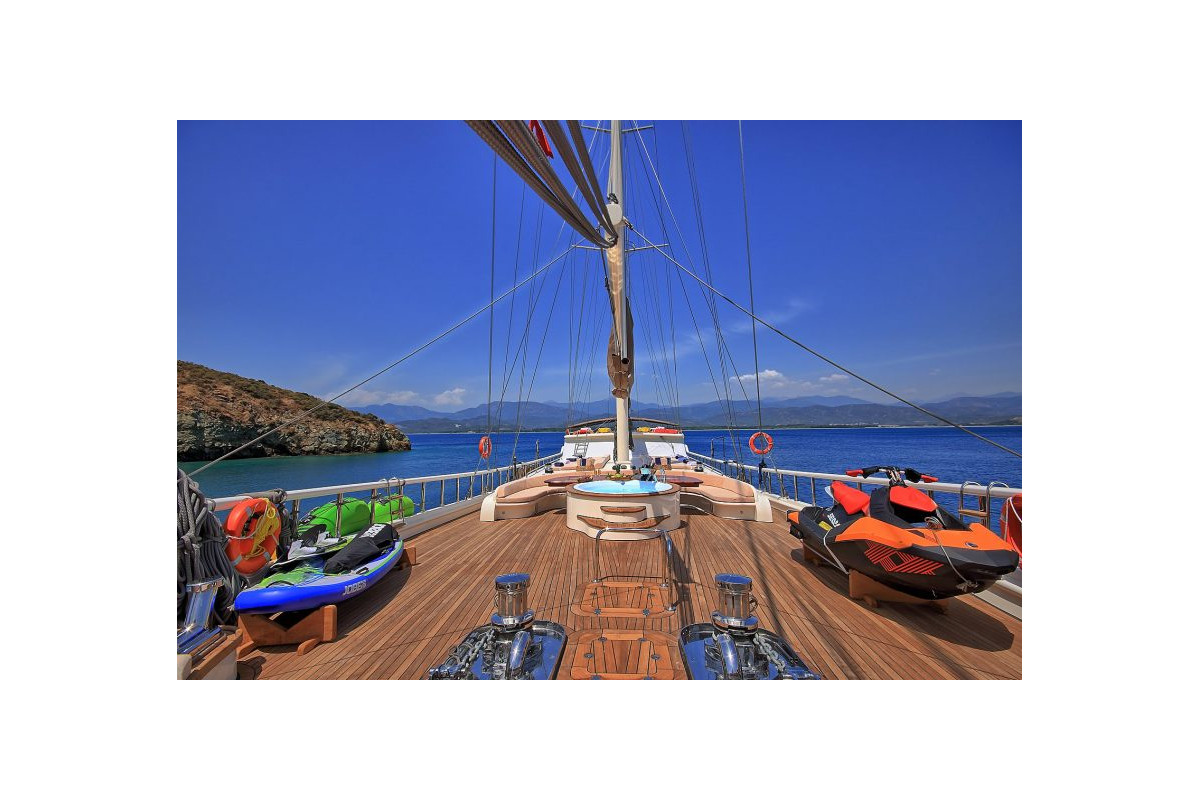 The gulet Queen of Salmakis was built in 2019. This boat that is 39,1 m long and 8,50 m large is providing Blue Cruise services to our dear guests with its 6 crew members. Our yacht that holds 2 Master Cabins, 4 Double Cabins, 2 Triple Cabins , more elegantand comfy than each other with their own WC and air conditioning, with a total of 8 cabins. It possess a 2 x Volvo 600 Hp horsepower and a 2 x 40 kVa generator. A dedicated living space fort the crew, a fully furnished kitchen, indoor and outdoor spaces for eating and relaxing, and an American bar are available. There are enough sun bath cushions, chairs and services for every single guest. This yacht that is built to make our guests live the comfort, the luxury and the serenity at the same time, can reach a speed up to 10 nautical mile. Queen of Salmakis Gulet, fully furnished with navigational devices Wireless, GSM Phone you will feel in security during all of our preferred destinations like Bodrum, Marmaris, Fethiye, Göcek Beside that, a LCD TV, a DVD player and a stereo music player are available for our dear guests in the living room. For those who want to stay connected, a Wi-Fi service can be provided in our boat, limited inside the Turkish waters. Our sportive guests can optionally participate to watersports excursions such as Wake Board, Jetski, Ringo, Water Ski, Canoe, An occasion for our guests that want to enjoy their Blue Cruise in the virgin bays of Turkey to entertain themselves.